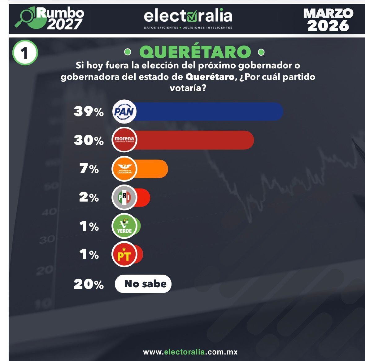 📊🔍 Así va la contienda en Querétaro: PAN a la cabeza, Morena en segundo lugar. Pero según #LosDatos Pero 1 de cada 5 personas aún no define su voto marzo 22, 2026
