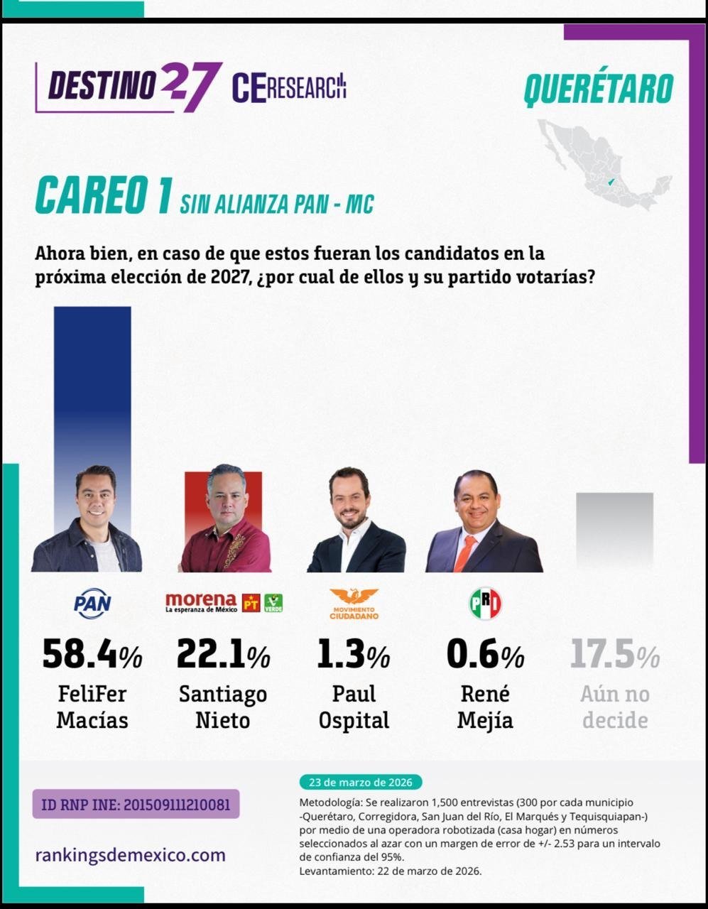 📊🔍 Así va la contienda en Querétaro: PAN a la cabeza, Morena en segundo lugar. Pero según #LosDatos Pero 1 de cada 5 personas aún no define su voto marzo 22, 2026 Ver más