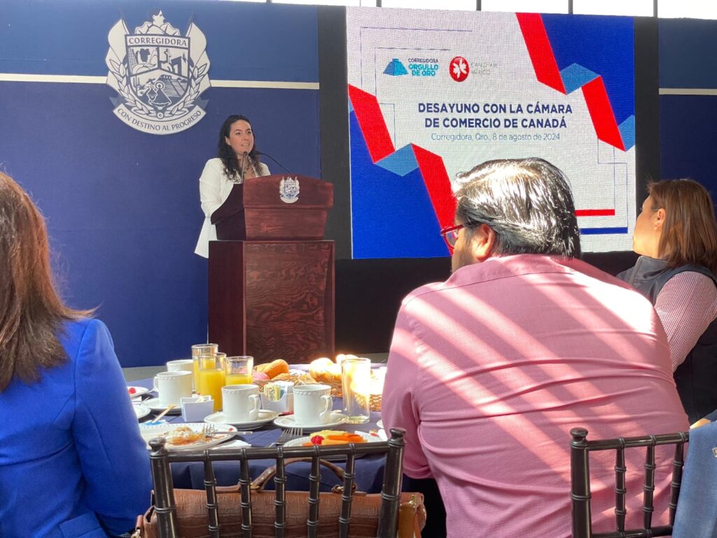 El presidente municipal de Corregidora, Adolfo Colín Sánchez, encabezó un desayuno con integrantes de la Cámara de Comercio de Canadá en México, donde les compartió las cualidades con las que cuenta la demarcación para la instalación de empresas.